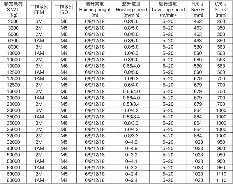 雙梁鋼絲繩電動葫蘆選型表: